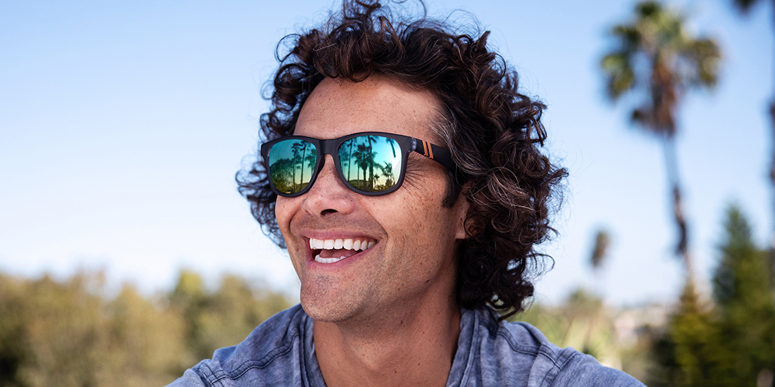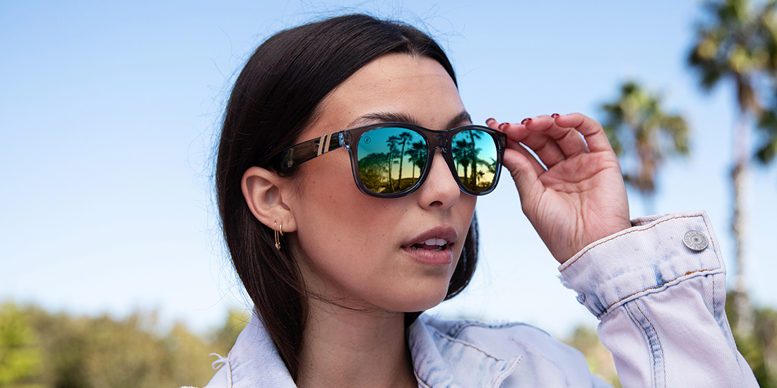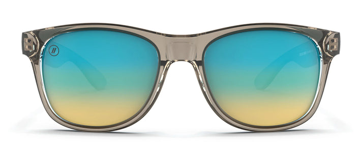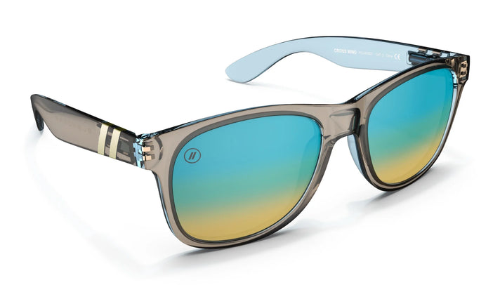 'Cross Wind' breezes in with effortless style. The transparent sepia tone is nuanced and accented beautifully by crystal blue on the interior of the frame and temples. The gloss finish of these classic sunglasses emphasizes its color palette, while a polarised rainbow lens is the finishing touch. These are durable shades that are anything but ordinary. //