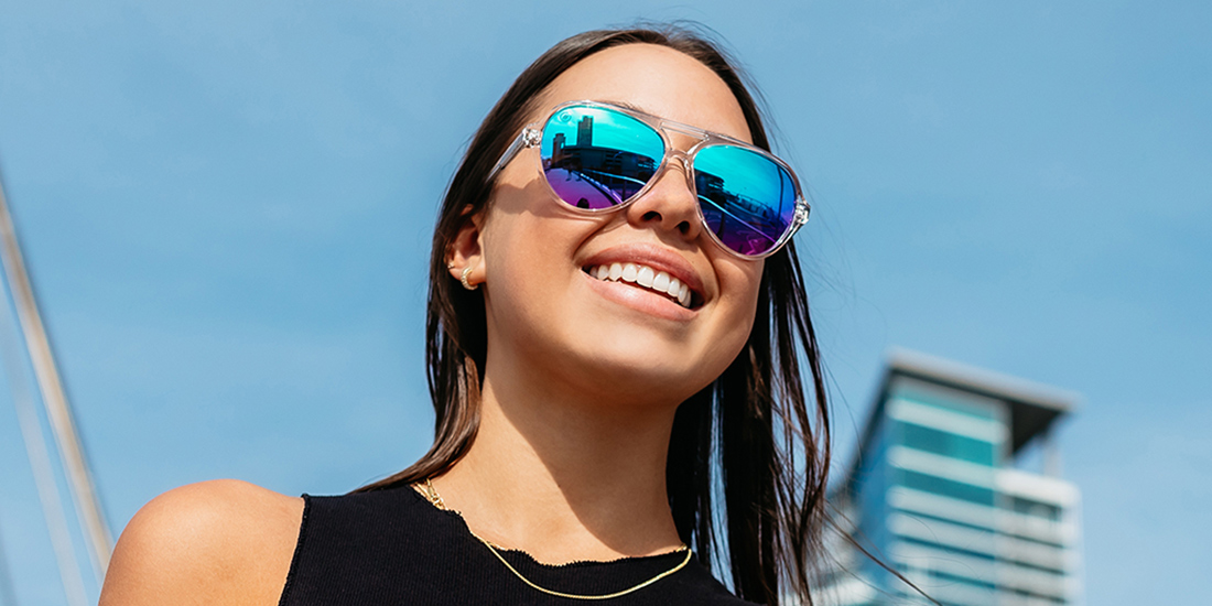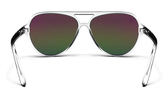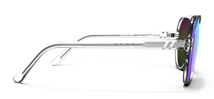 Travel light with the ethereal splendor of ‘Crystal Orb.’ The blue-purple polarised lenses seem to float on the face thanks to a crystal clear aesthetic that extends from front frame to temple tips. For some extra dazzle, we’ve incorporated a visible silver metal core that streaks down the sides. Matching silver temple stripes round out the captivating design. //