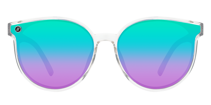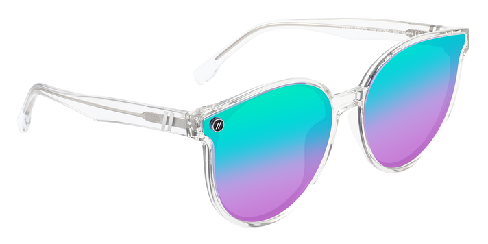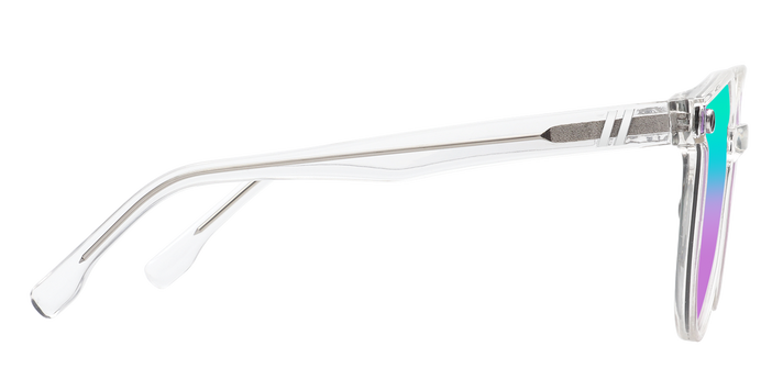 Effortless style is just an ‘Add to Cart’ click away. 'Miss Cool' delivers an icy cold aesthetic thanks to a glossy crystal clear frame and temples. The ethereal design makes the polarised green to purple gradient lens pop all the more, sending a clear style statement across any room. //