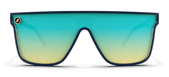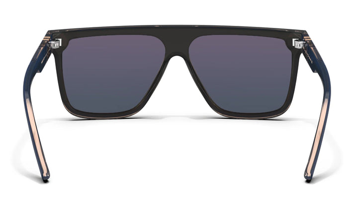 Dueling tones and finishes define the progressive style of 'Night City.' These flat top sunglasses are glossy on their interior and matte on their exterior, and the colorway is characterized by slate and champagne hues. A polarised aqua lens with a rainbow effect is the exclamation point on a bold yet sophisticated look. //