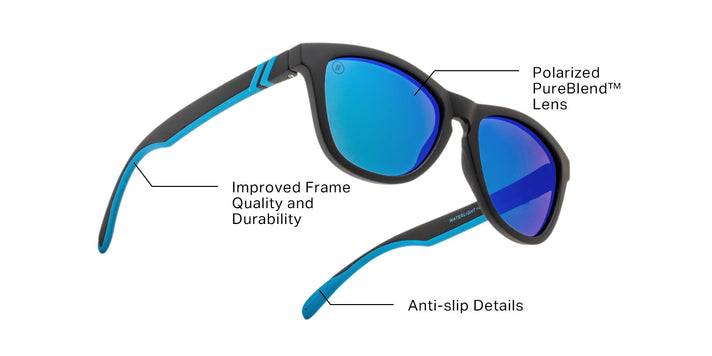 Take the plunge with ‘Waterlight.’ Featuring the sensational Italian-sourced frame material of our ‘Float₂O Pro Collection,’ these polarised sunglasses are our finest floatable Blenders yet. Durable and lightweight, we’ve added the power of our PureBlend Lens to significantly increase optical clarity and scratch resistance. Malibu Blue accents and rubberized, anti-slip detailing cap off a look that’s always dripping but never watered down. //