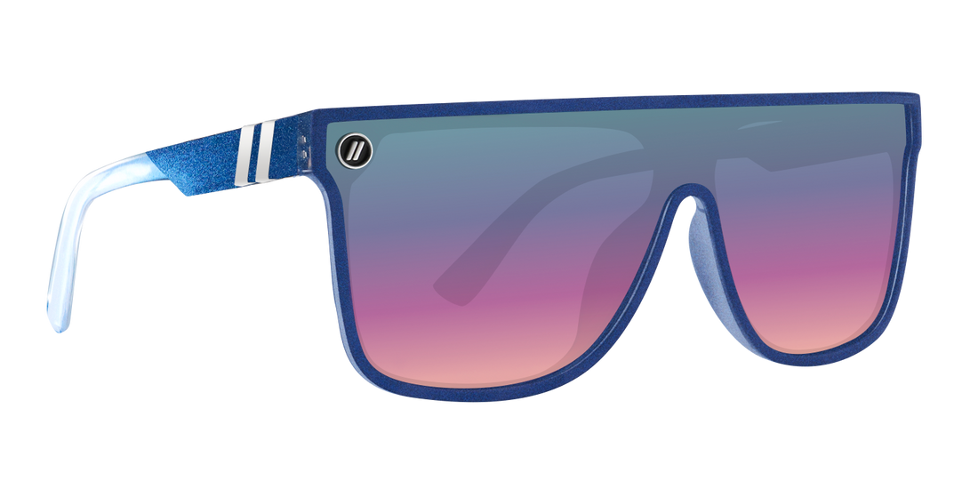 Flat top sunglasses with a modern frame and a retro finish? If that sounds like your jam, 'Discomania' delivers. The single lens design and aggressive angles are undeniably progressive, and the luminous, iridescent sheen on the frame and temples dazzle. Oh, and that polarised lavender lens? Simply perfect. //