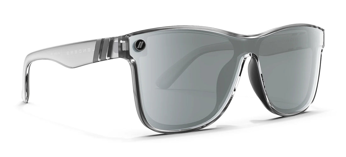 Blend Out with the bold look of 'Silver Strike // Millenia X2.' This iconic single-lens style gets a stark, powerful tone-on-tone treatment — its crystal clear frame, silver mirrored lens, and gunmetal Life in Forward Motion stripes make a strong statement. The interior of these polarized sunglasses goes the extra mile with a silver metallic finish. //