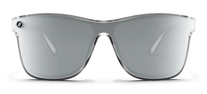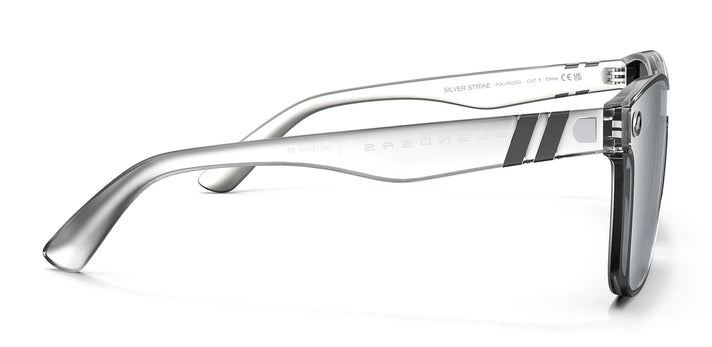 Blend Out with the bold look of 'Silver Strike // Millenia X2.' This iconic single-lens style gets a stark, powerful tone-on-tone treatment — its crystal clear frame, silver mirrored lens, and gunmetal Life in Forward Motion stripes make a strong statement. The interior of these polarized sunglasses goes the extra mile with a silver metallic finish. //