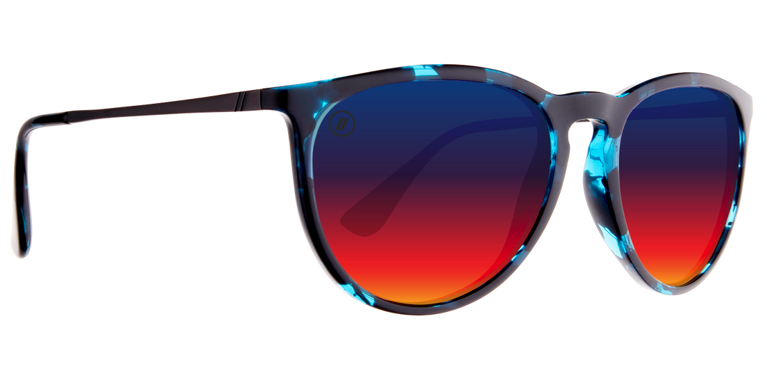 Drive ‘em out of their minds with 'Crazy Daisy!' These round sunglasses pull off “contemporary cool” with ease thanks to a glossy crystal teal frame with a black tortoise pattern. A polarised blue to red lens adds additional wow factor, while gunmetal-plated metal temples add a matte-finished contrast. //