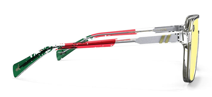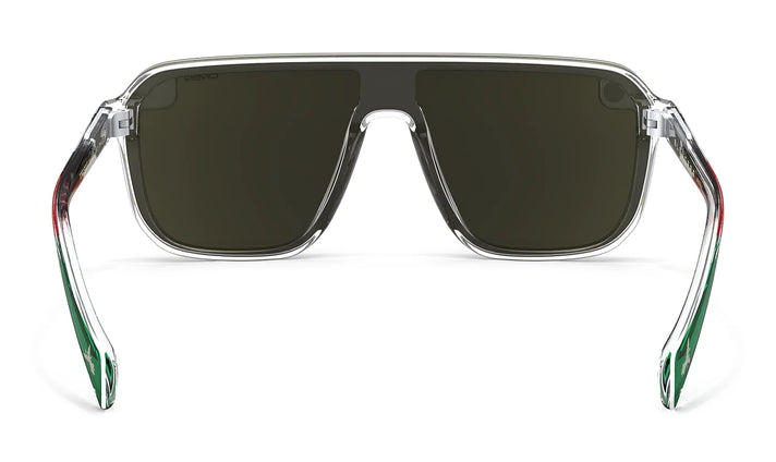 The Oracle Red Bull Racing Collection 'Toro Rojo' shades are a limited-edition tribute to the speed, style, and tradition of the Mexico City Grand Prix. We’ve splashed the crystal-clear temples with red and green in a proud nod to the Mexican flag and detailed each tip with the silhouette of the famed El Ángel de la Independencia monument. Our polarized, scratch-resistant PureBlend™ Lens — present in shimmering gold — takes the checkered flag. //